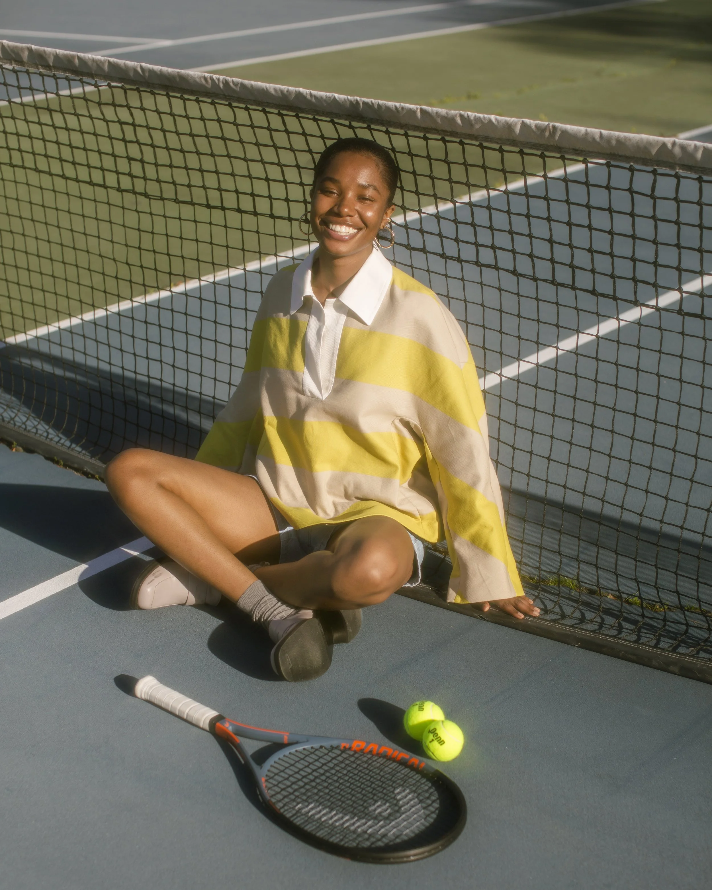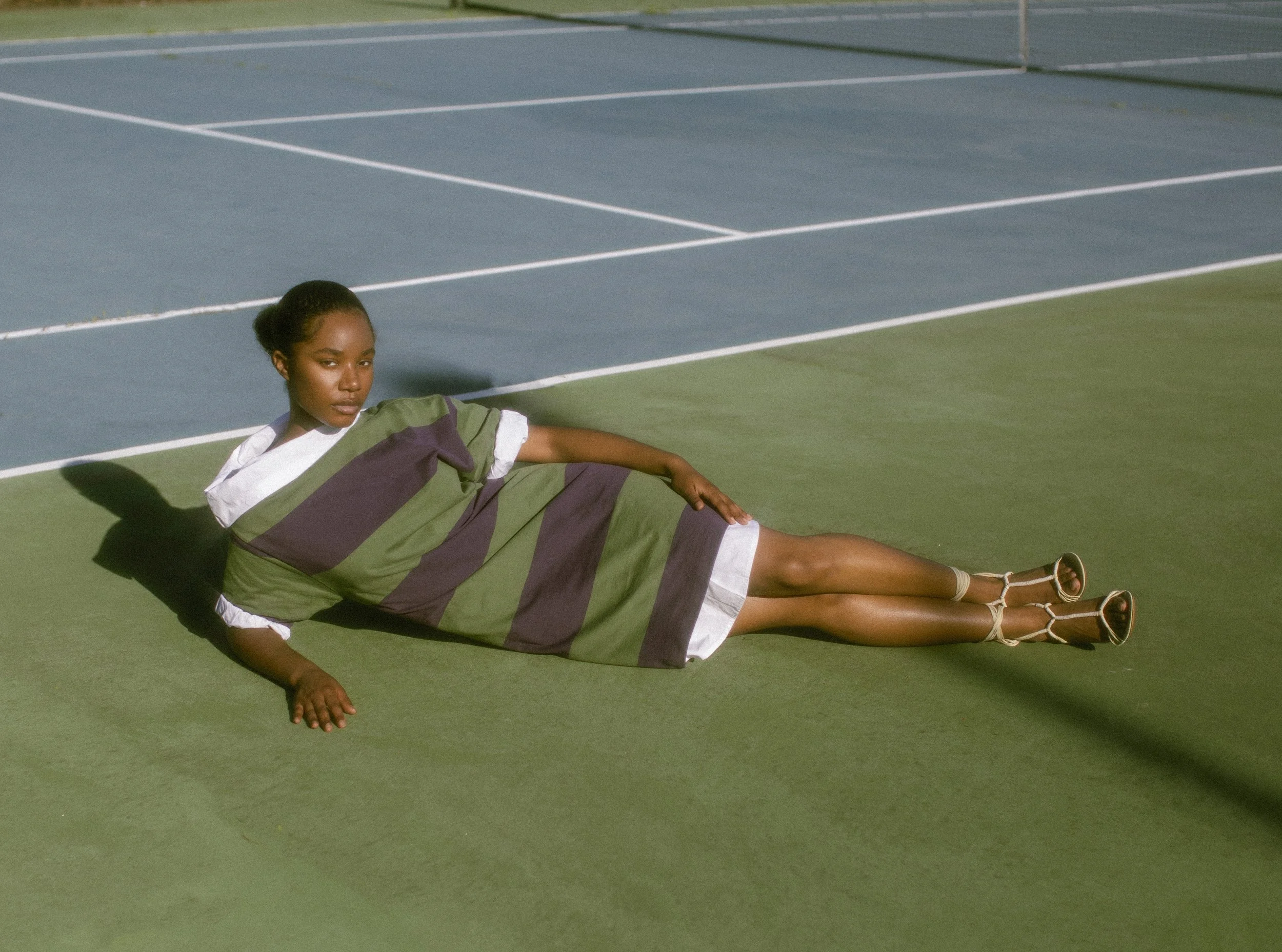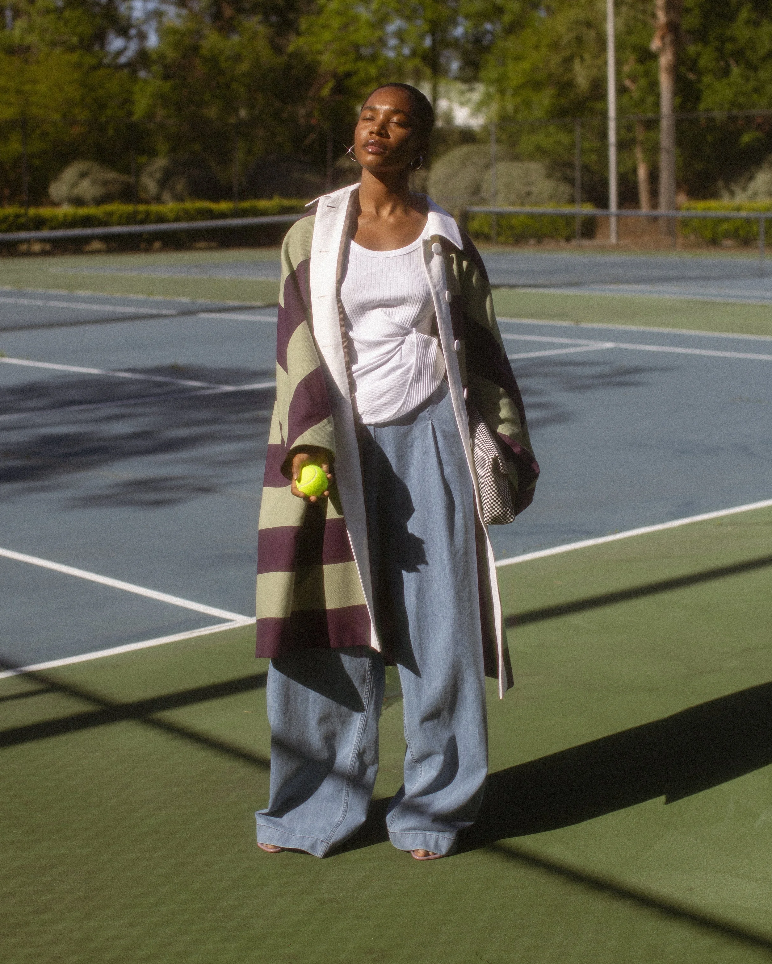A Dries Van Noten focused story shot on tennis courts. The setting mirrors the strong stripes and graphic patterns throughout the collection, creating a playful balance between sport and high fashion.